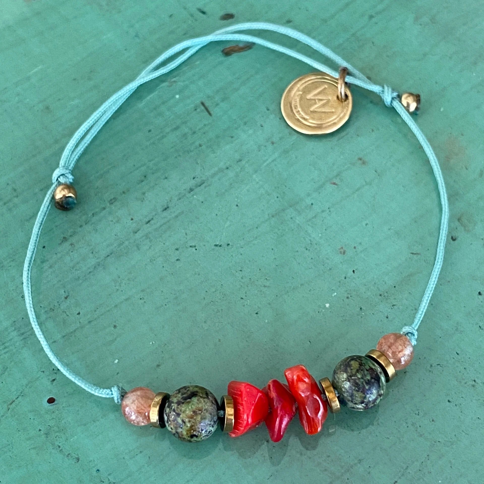 Mint kleurig nylon koord, hematiet, maan steen, Afrikaans turquoise, koraal kralen. Brons metalen details.
