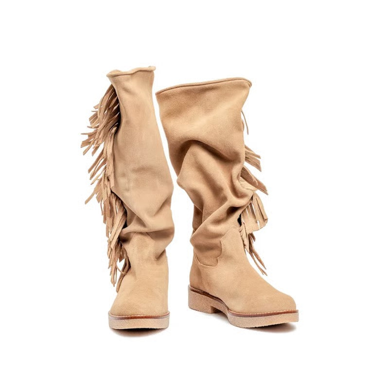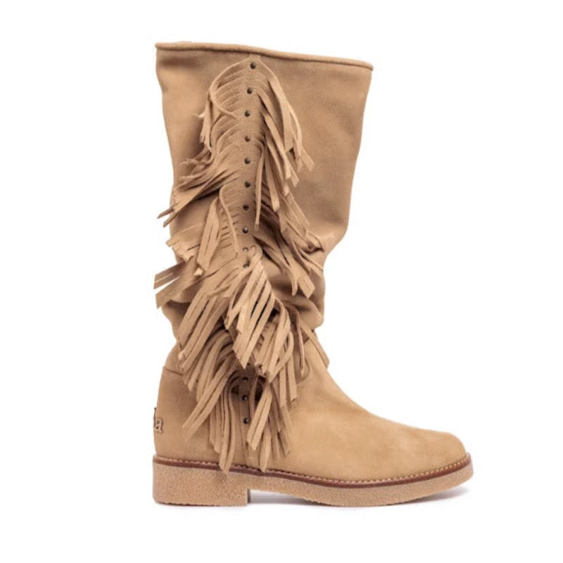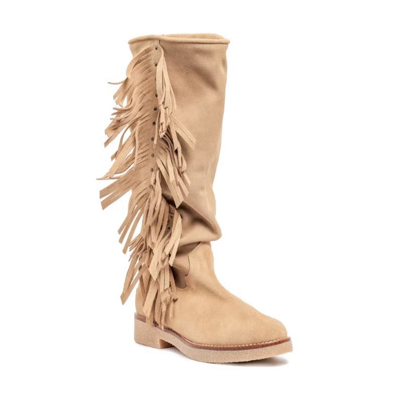 De Fringe Tall is een hoge laars met een losse schacht die natuurlijk op de enkels rust. Deze wijde laarzen en de franjes passen perfect bij een boho-look. Gemaakt van Spaans suède en gevoerd met leer aan de binnenkant. De crêpe zool biedt je de hele dag comfort, alsof je op sneakers loopt. De hak en neus behouden hun pasvorm op de lange termijn, zelfs als ze dagelijks worden gedragen.