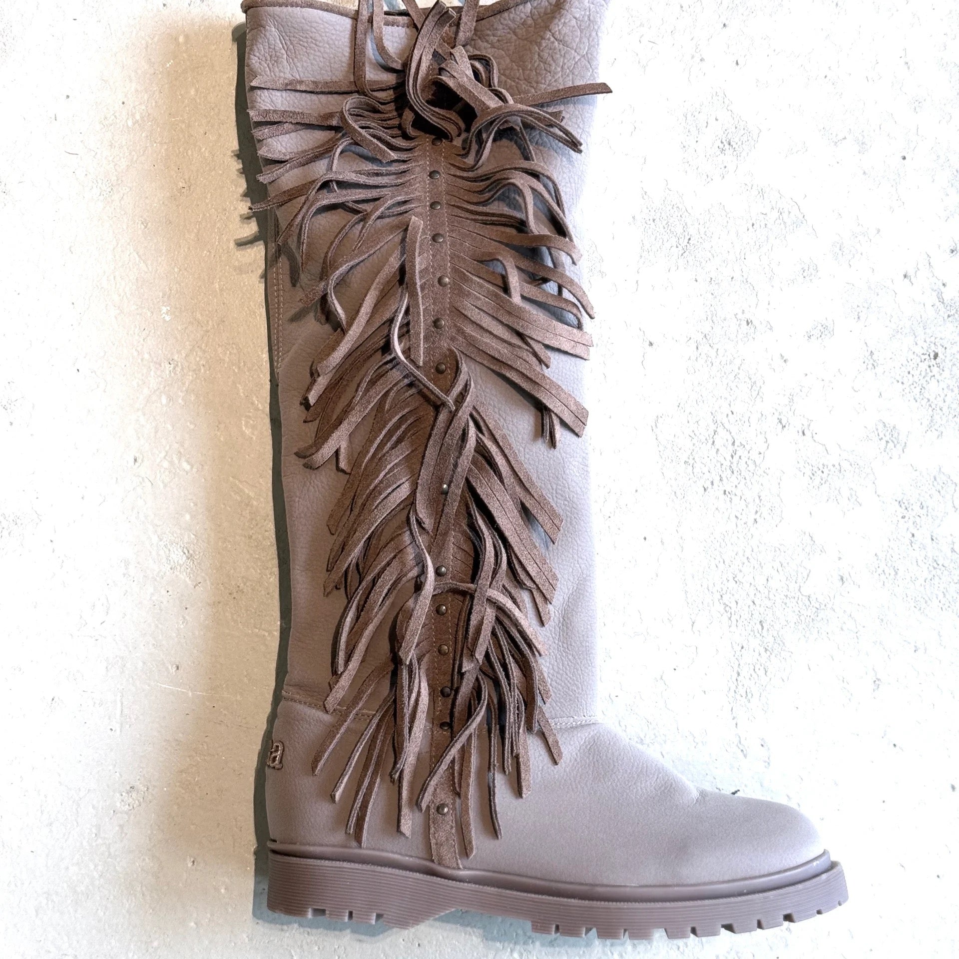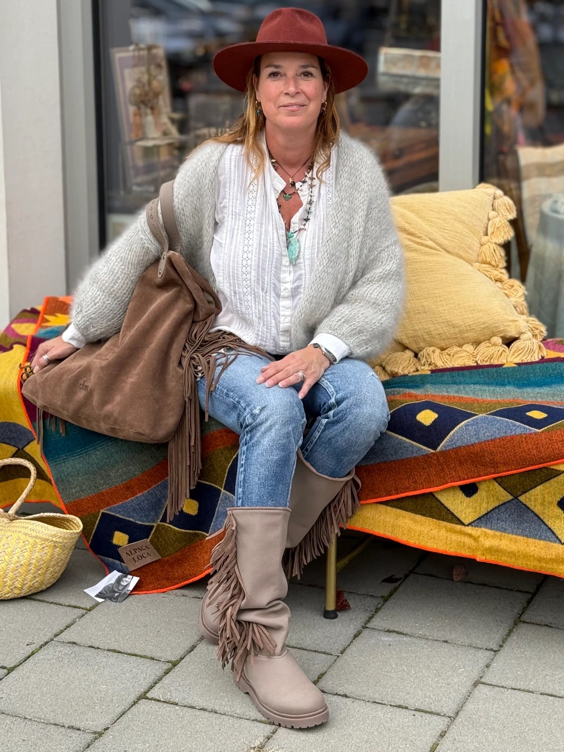 The Fringe Tall is a high boot with a loose shaft that naturally rests on the ankles. These baggy boots and its fringes match a boho-look perfectly. Made of Spanish suede and lined with animal-friendly merino wool around the feet, these boots and its polyurethane sole give you comfort all day long - like walking on trainers! The heel and nose maintain its fit on the long run - even when worn daily.