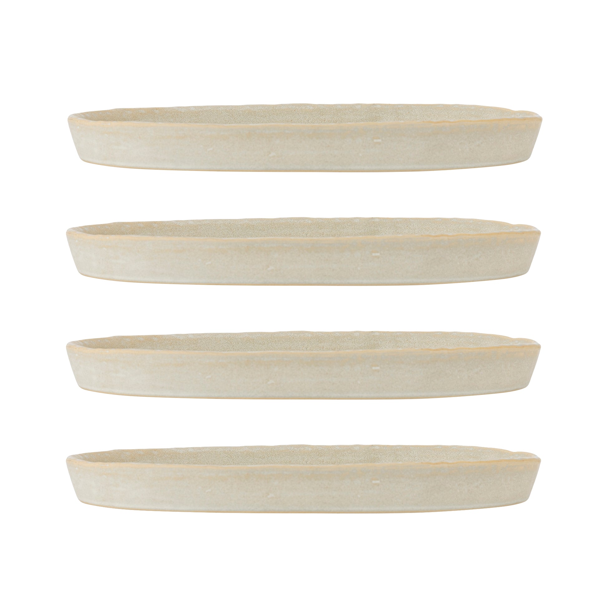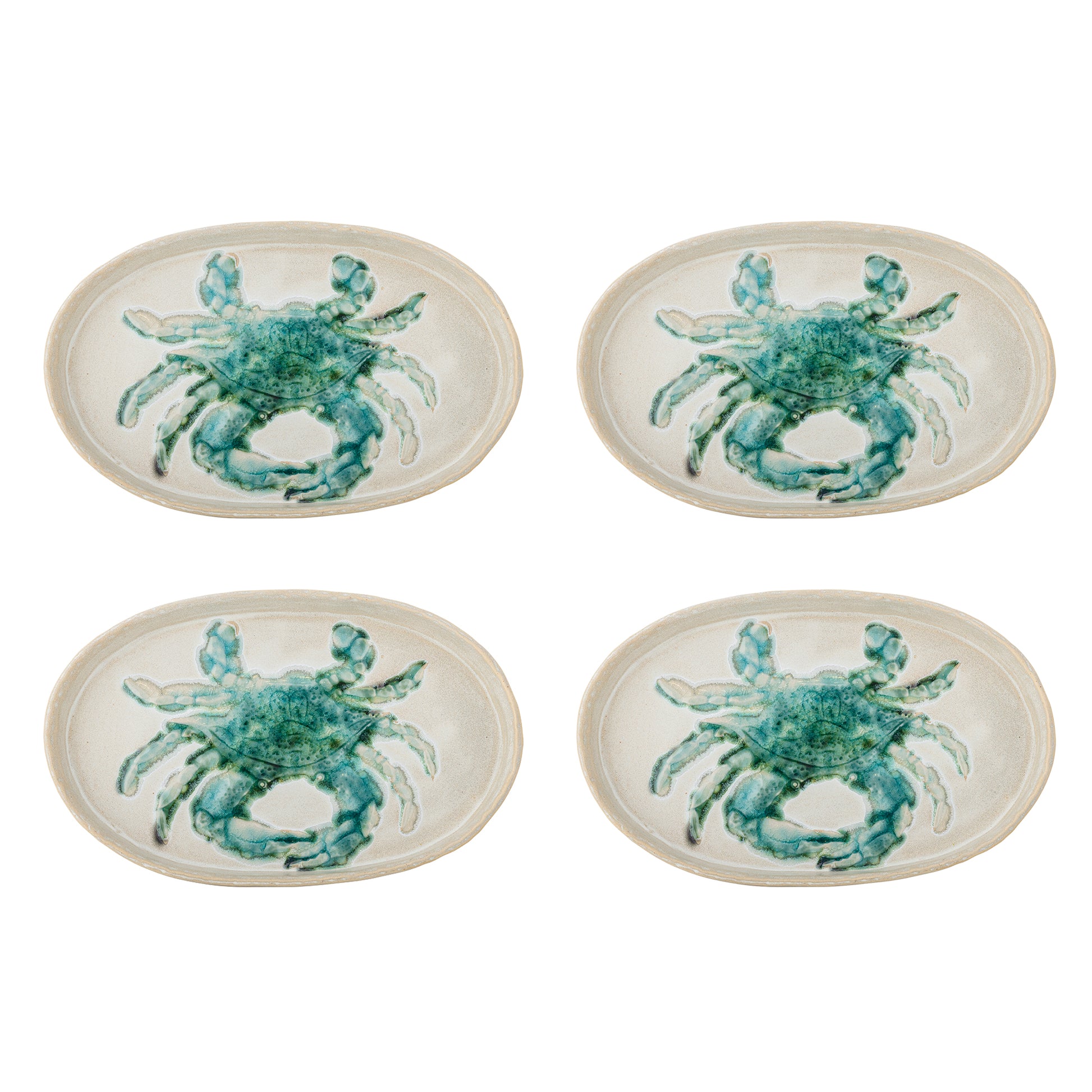 The Hadden Plate from Bloomingville is made of stoneware and features a glazed motif of a green crab at the centre. The glossy decoration contrasts with the matte surface, creating a playful and decorative expression. The plate comes in a set of four, and variations in the glaze make each piece unique.