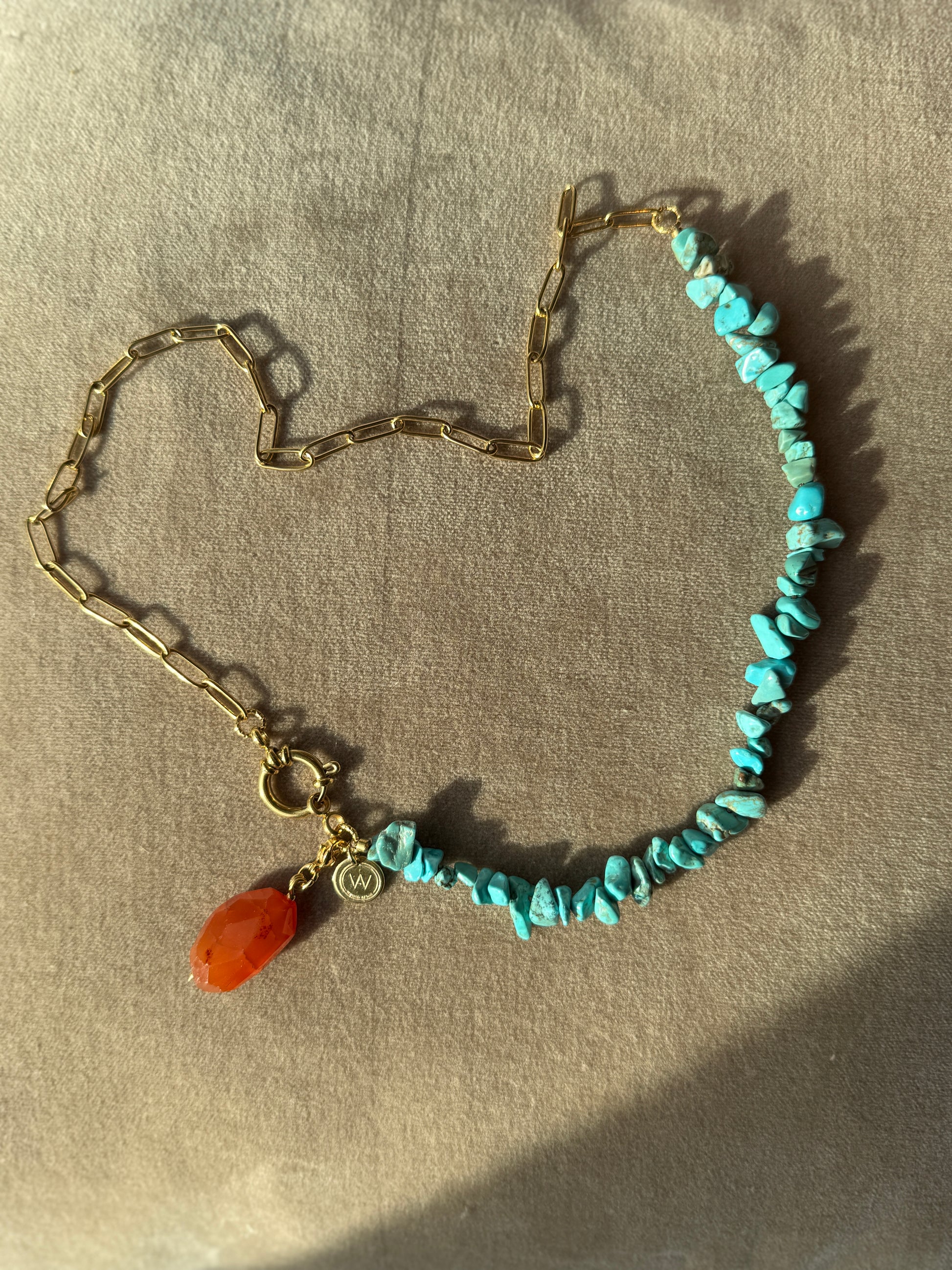 Deze ketting van Wanted by DaS is met de hand gemaakt van stukjes Turquoisel. De hanger is gemaakt van de edelsteen Carneool. De ketting sluit met een boeislot aan de voorkant. De ketting past zowel bij een klassieke outfit maar ook zeker bij je stoere jeans.