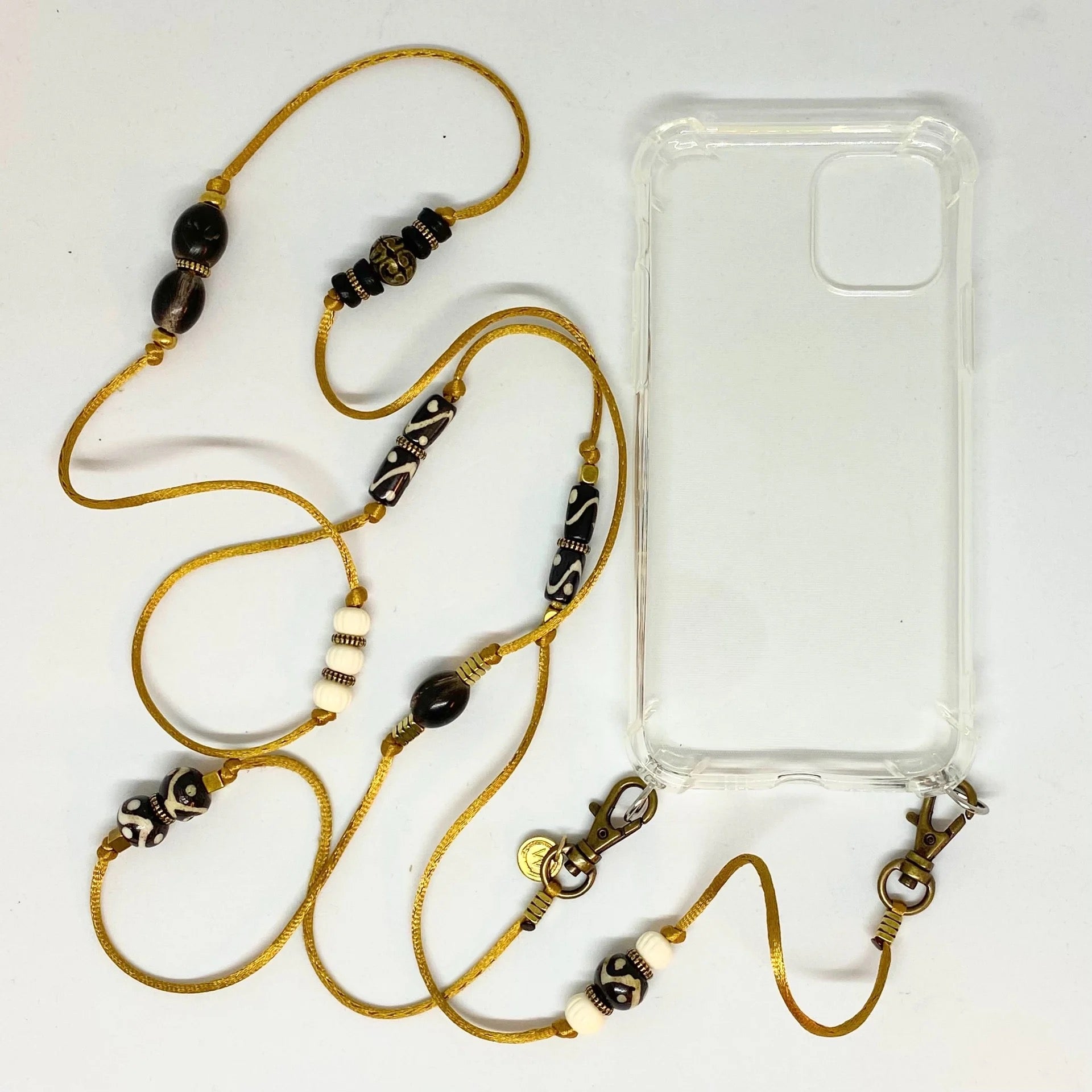 Zwarte en witte kralen en zilveren of brons kleurige metalen details. Het koord is makkelijk te verwisselen.