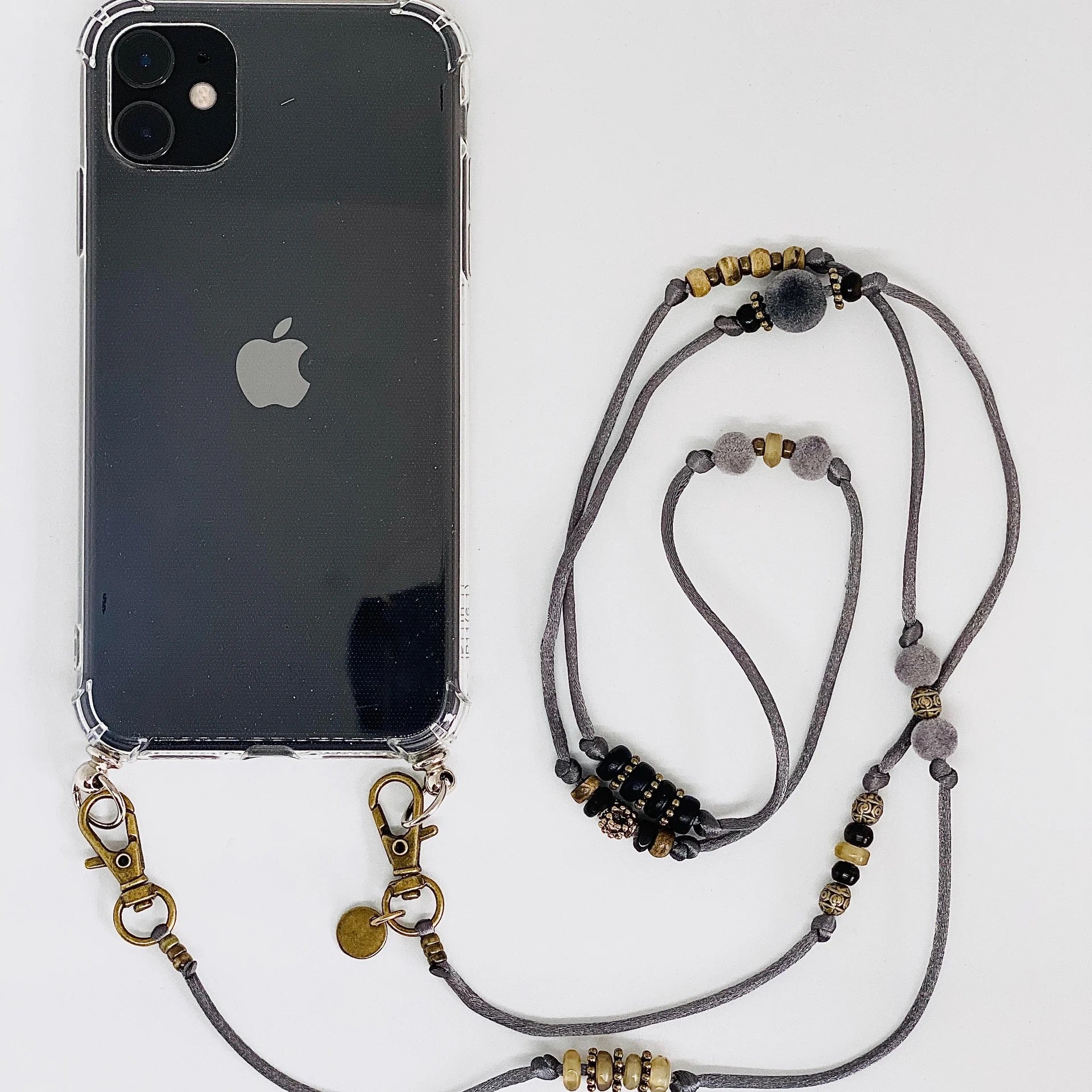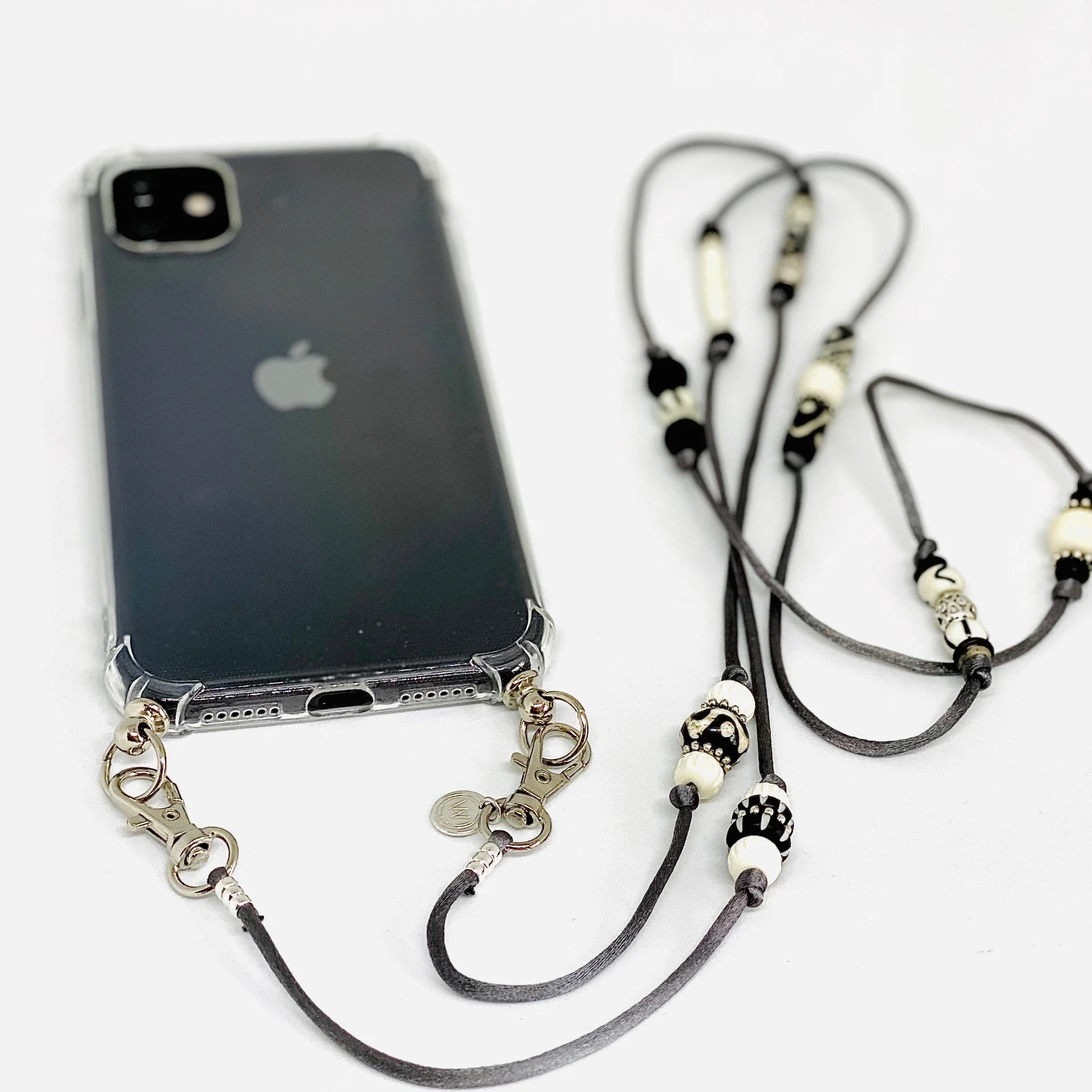 Zwarte en witte kralen en zilveren of brons kleurige metalen details. Het koord is makkelijk te verwisselen.
