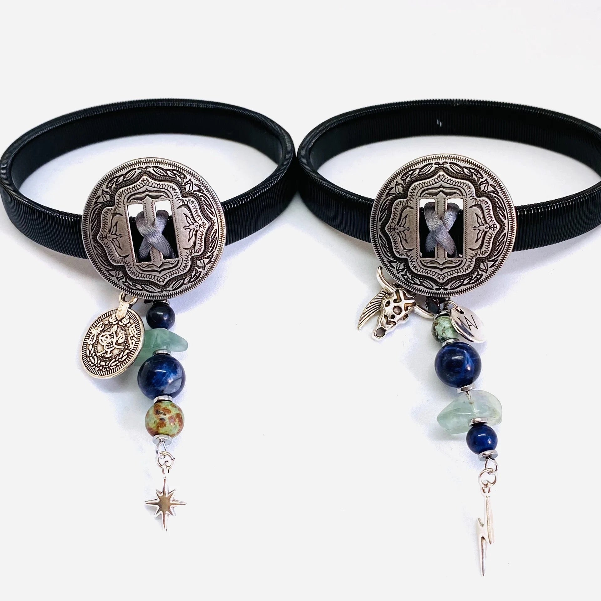 Sodalite, fluorite, African turqoise, hematite gems. Silver colored charms. Sleeve holders Hand made, price by set.