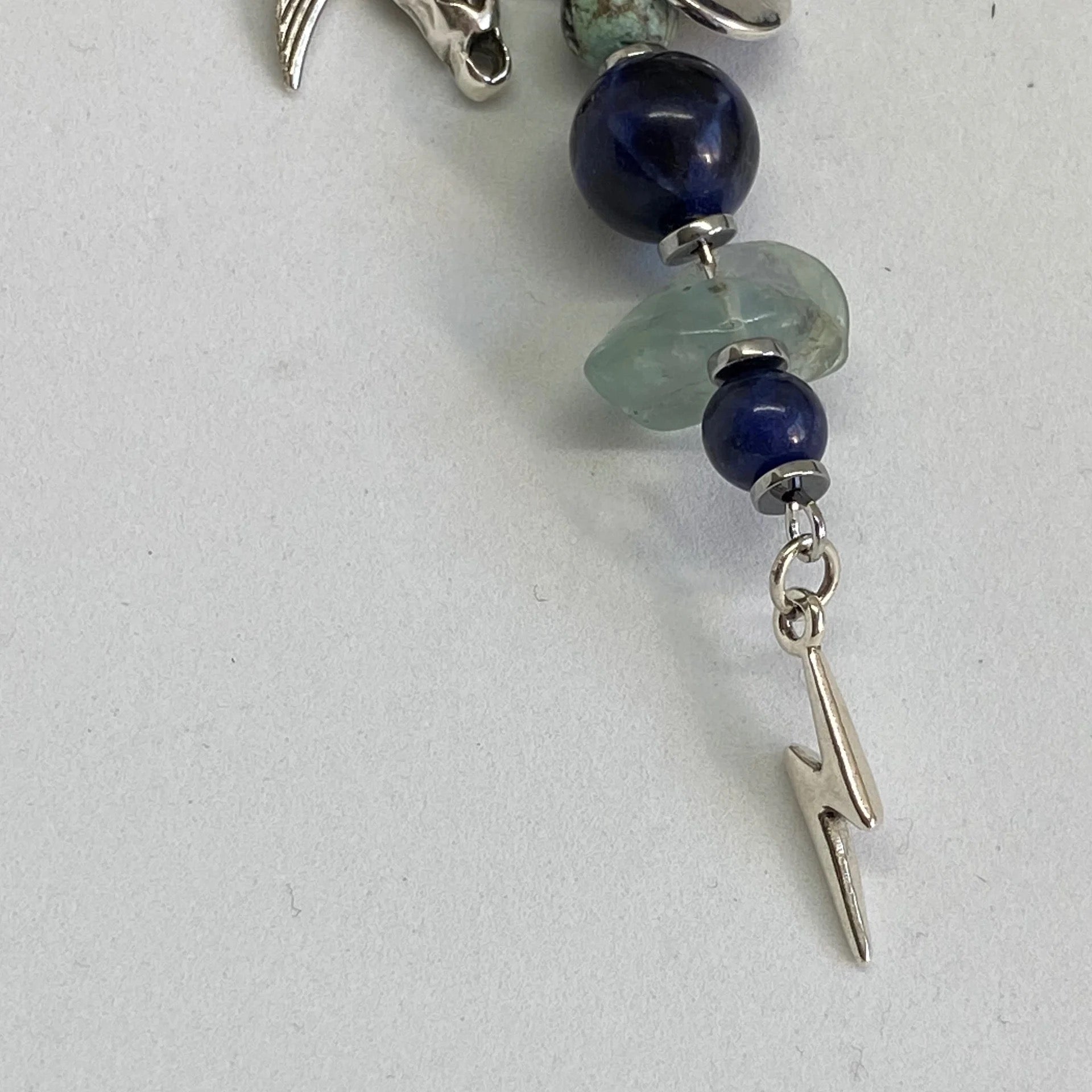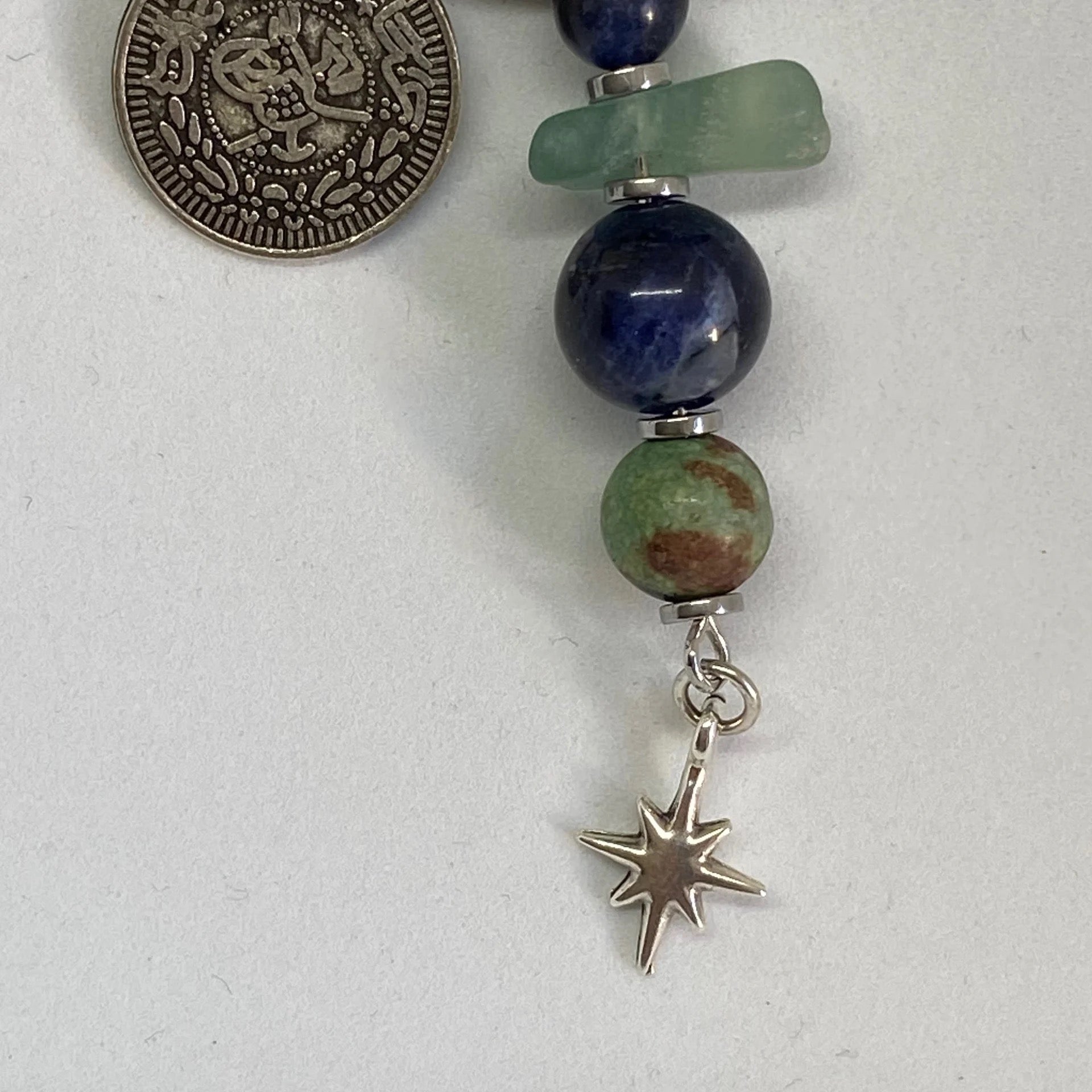 Sodaliet, fluoriet, afrikaans turquoise, hematiet edelstenen. Zilver kleurige bedels.