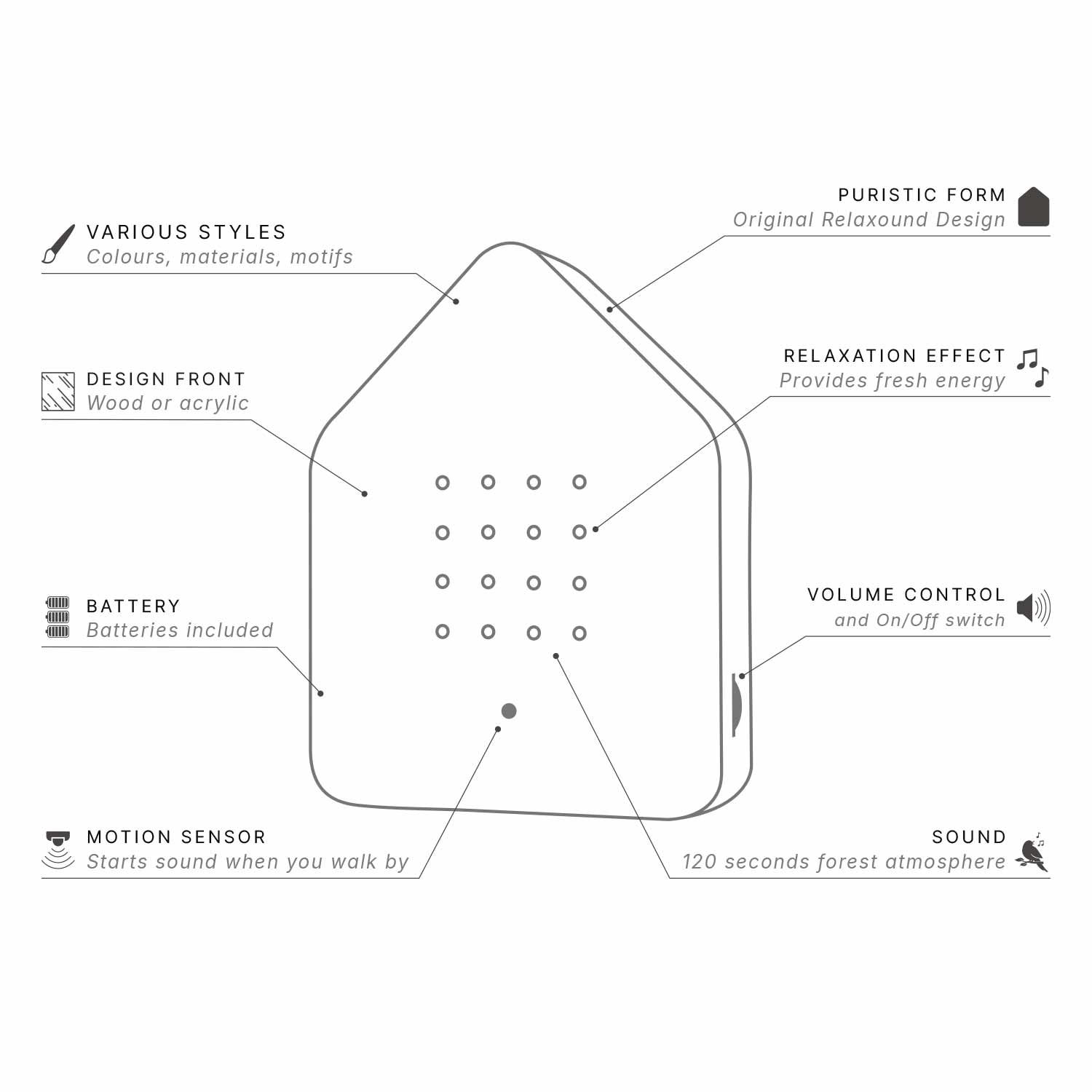 The Relaxound Zwitscherbox gives you precious moments of relaxation. Soothing nature sounds let you walk through a morning forest: The cheerful chirping of blackbirds and other songbirds immediately calms. You feel how your head and body intuitively relax and become cleared.